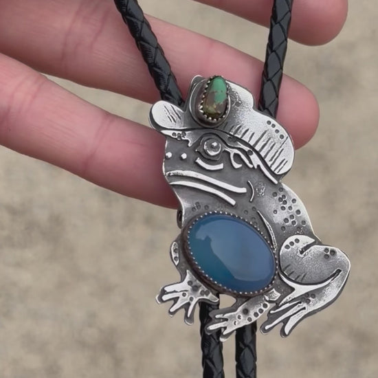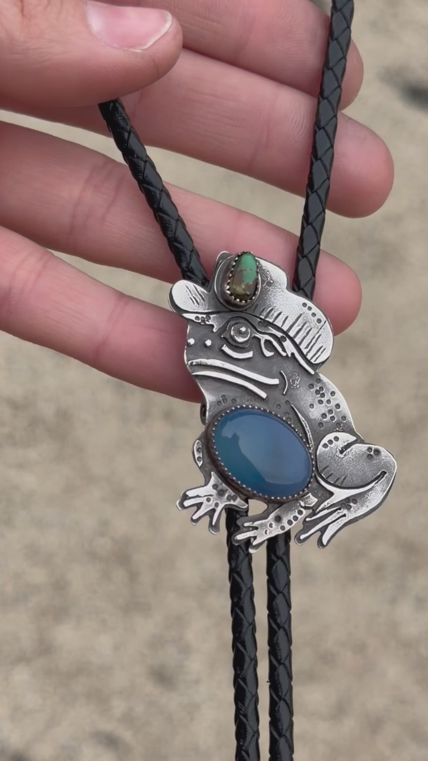 Blue chalcedony and turquoise Howdy, Frog! All hand sawed, and layered together. This guy is super rad! Height is approximately 55mm, width 42mm.