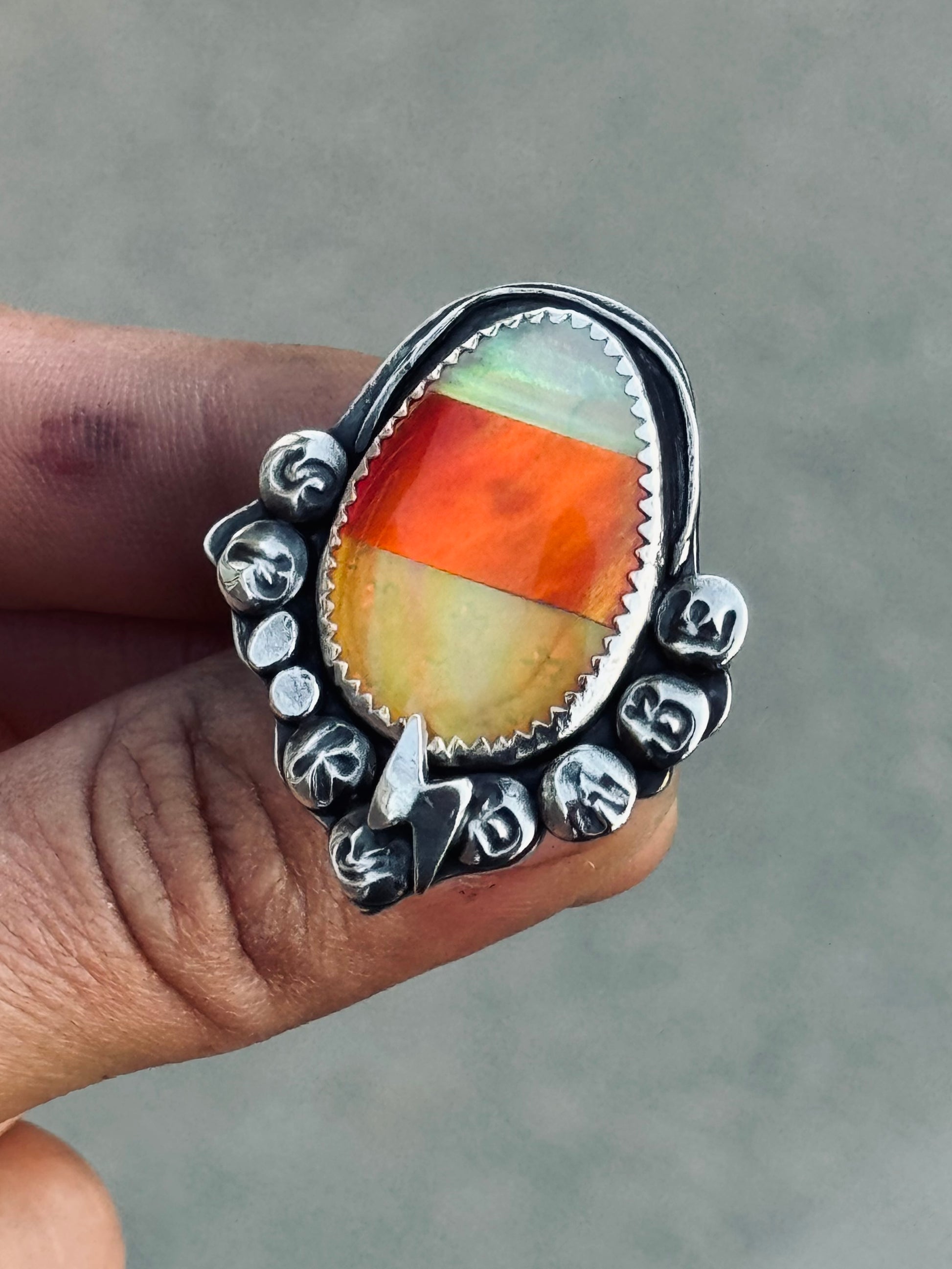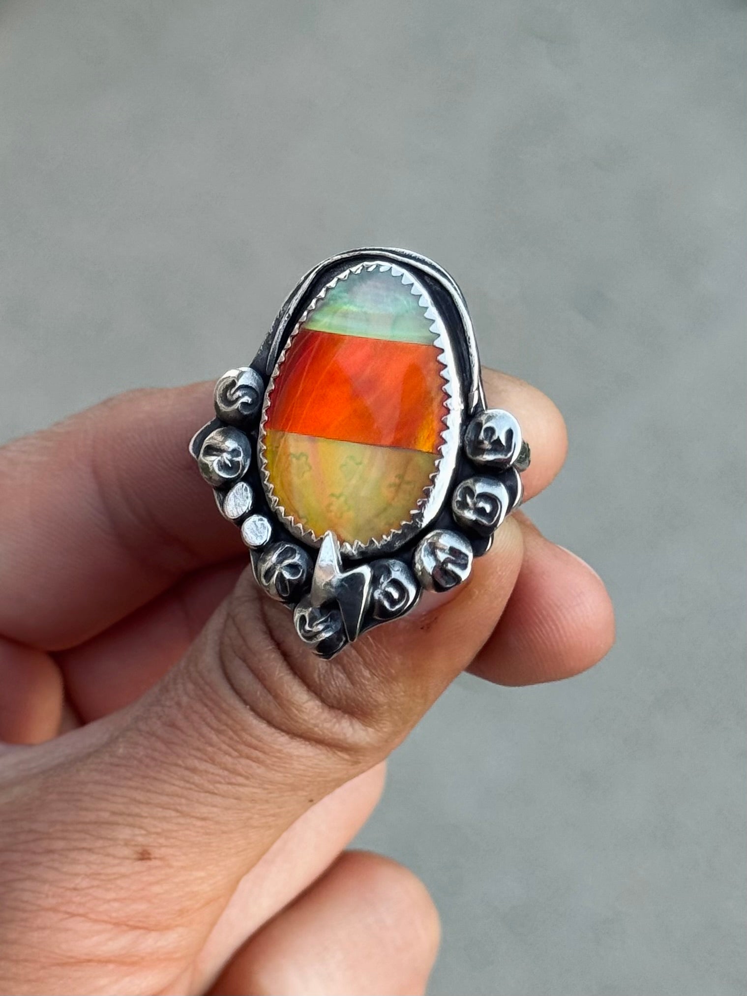 The Spooky Babe Ring features an iridescent candy corn ghost design with a hand-crafted cabochon centerpiece. Mini hidden stars shimmer subtly beneath the yellow stone, adding a playful touch. Its hand-hammered double split star band is set on a thick backplate, ensuring both durability and comfort. Measuring approximately 35mm in height and 32mm in width, this sturdy ring makes a bold yet charming statement for any occasion.