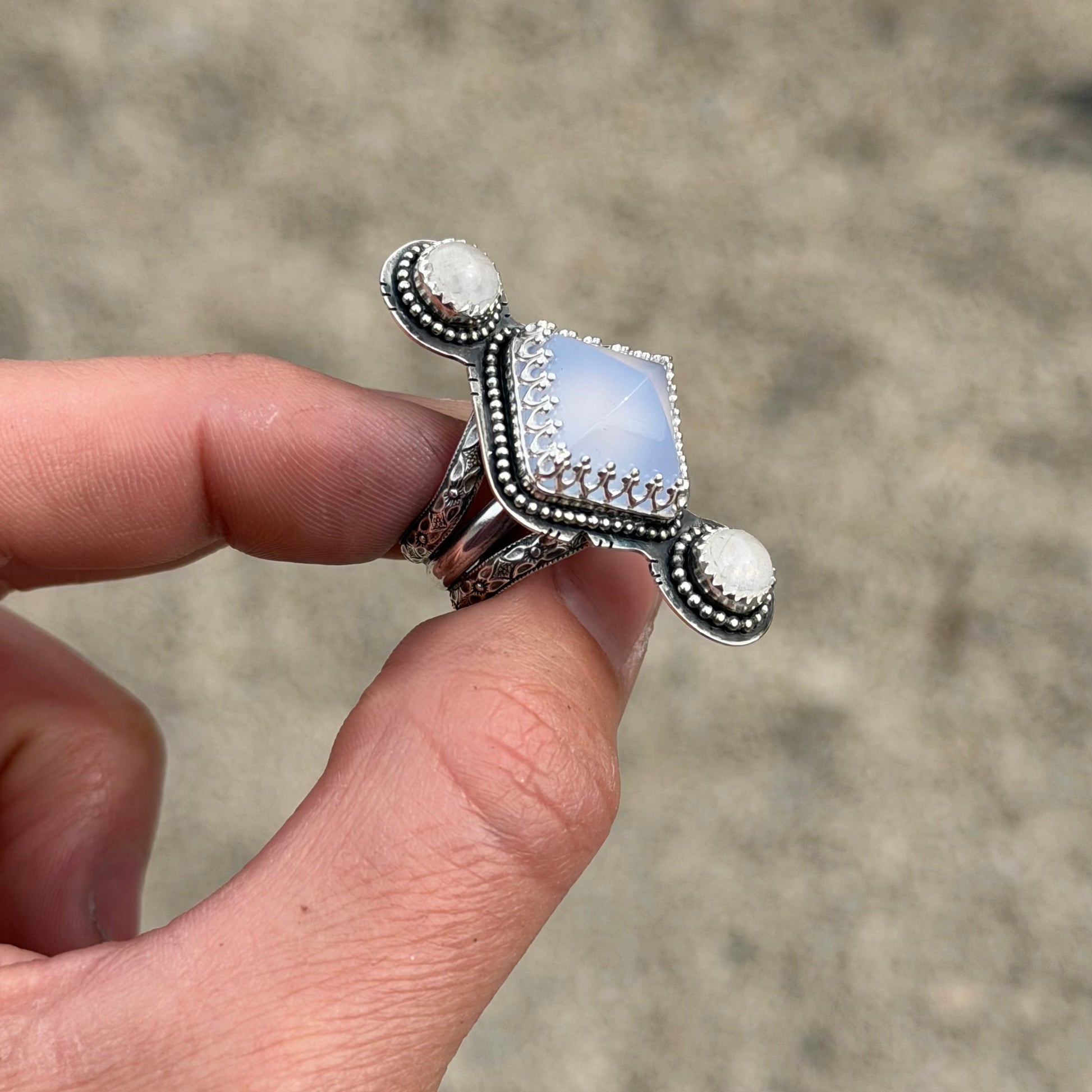Chalcedony with rainbow moonstone. True to size band. Height is approximately 39mm, width 24mm
